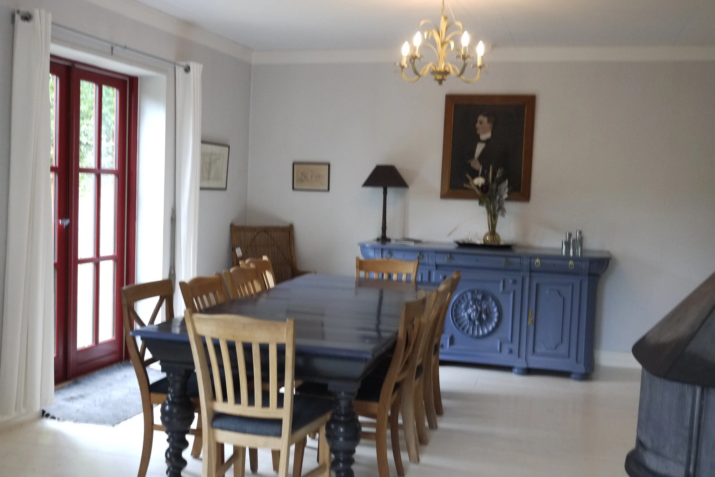 spiseplads samt et stueområde med en stor sofa og spisebord med plads til mange. Der er